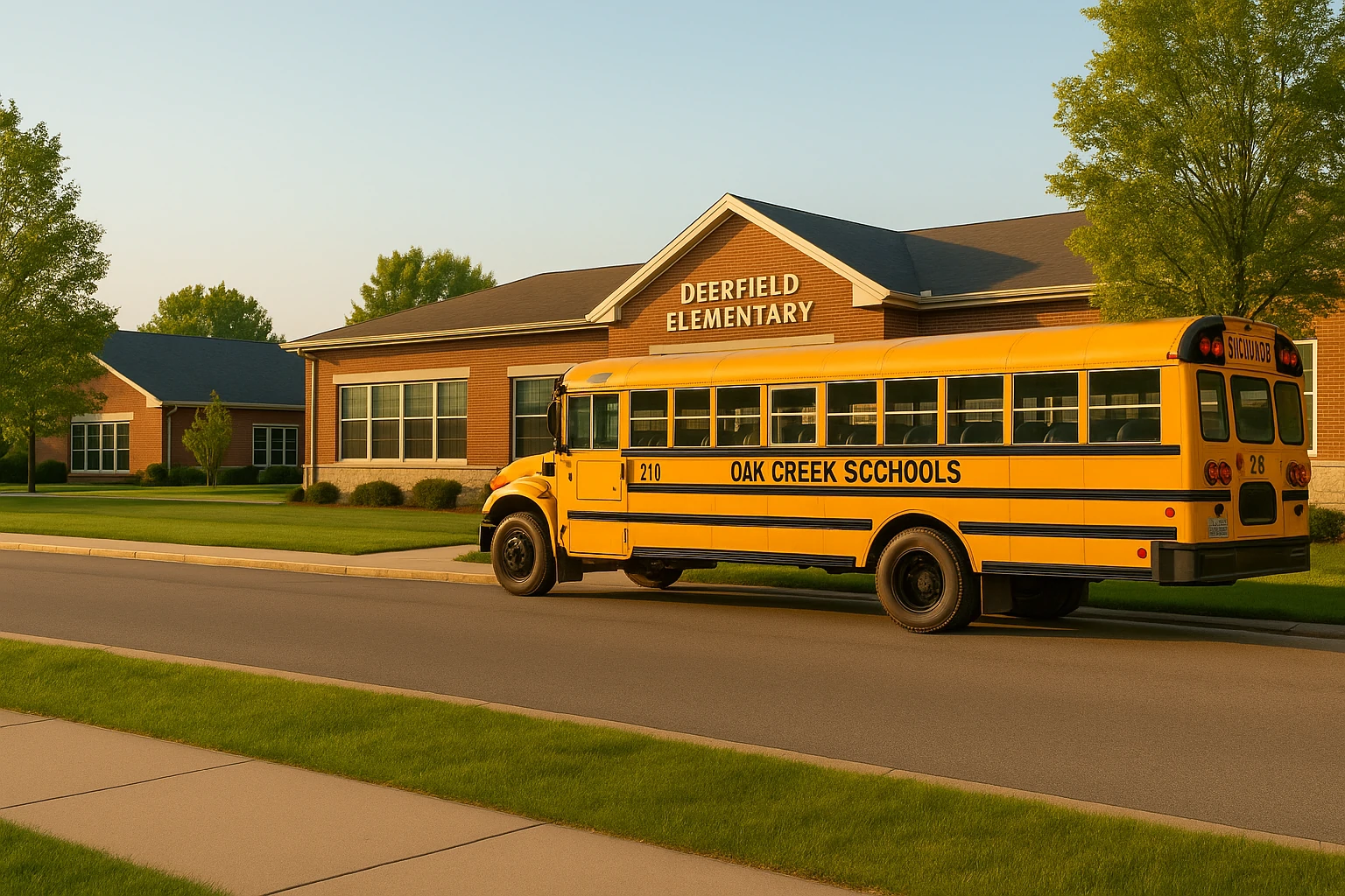Nearby schools include Deerfield Elementary, East Middle School, and Oak Creek High. School buses pick up close to the property.