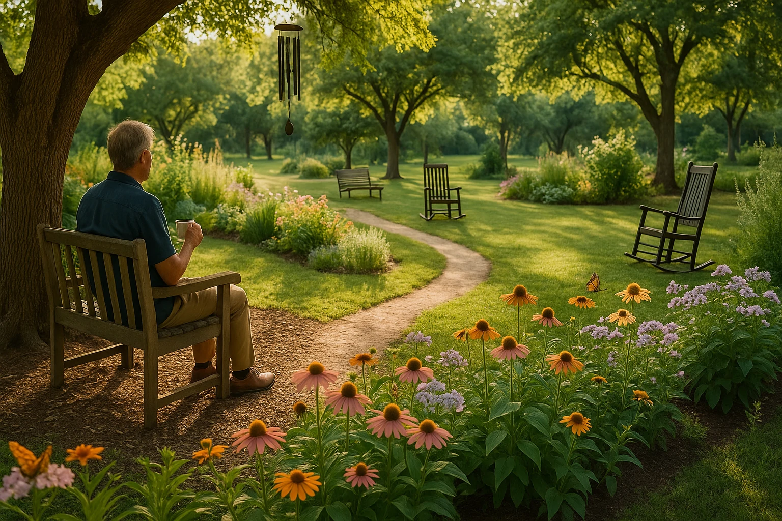 Benches sit under trees. Rockers line the edge of the lawn. Wind chimes offer soft music. You find rest in the smallest things-a fallen leaf, a sunbeam on your arm, a cup of tea in your hand. You do not find that in cities. You find that here.