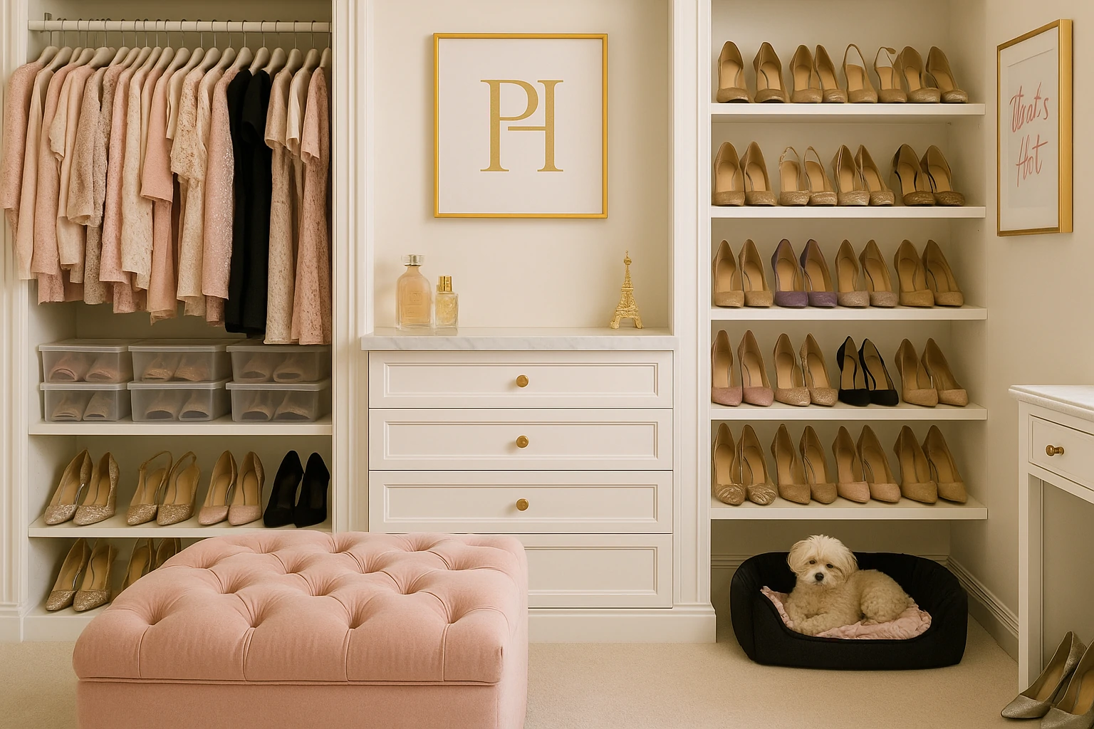 She keeps rooms tidy, even with many items. Her walk-in closets stay organized, with each row showing color, type, or brand. Shoes sit in clear bins. Clothes hang by theme. Even her beauty area stays labeled and clean.