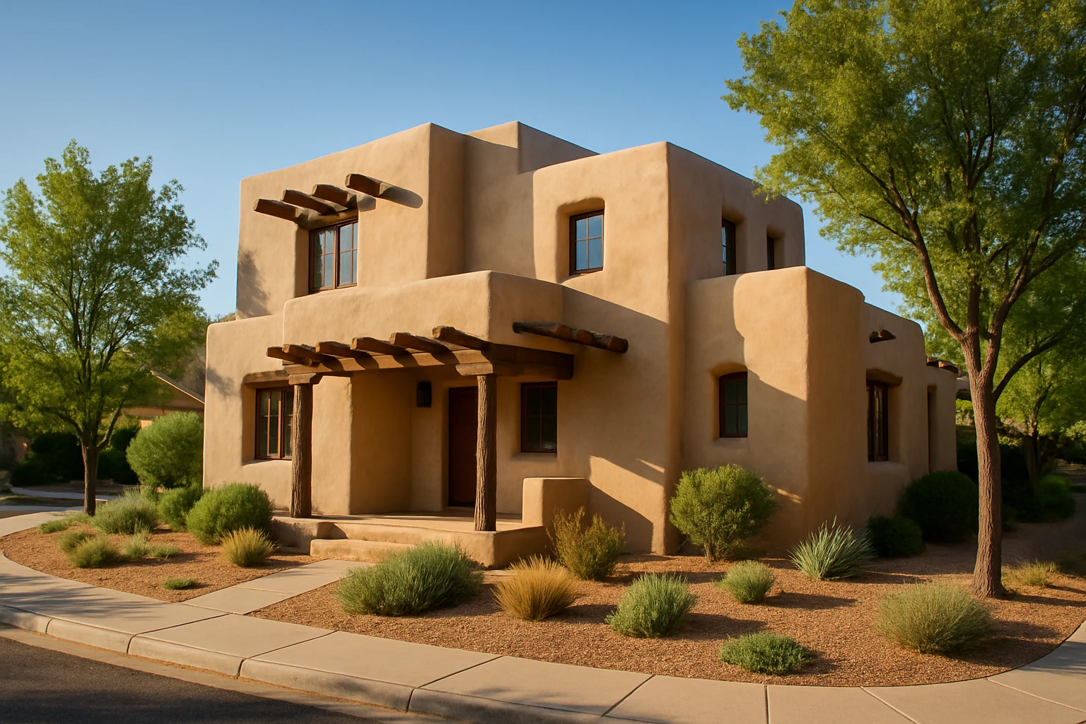 Realistic Pueblo-style home with flat roof, adobe walls, rounded corners, and wooden beams on a landscaped corner lot.