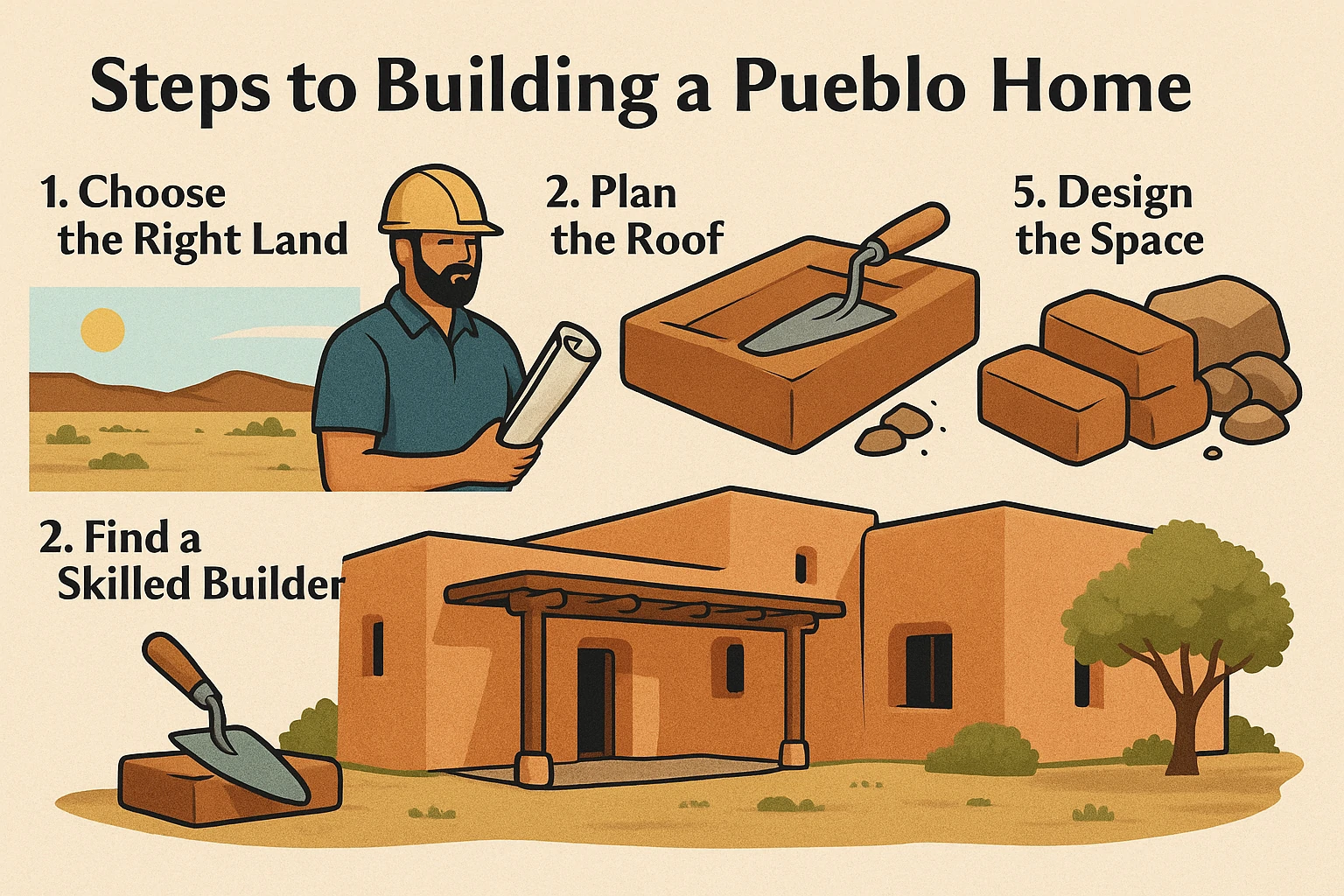 Illustrated steps for building a Pueblo home, including builder, adobe bricks, and finished Pueblo-style house.