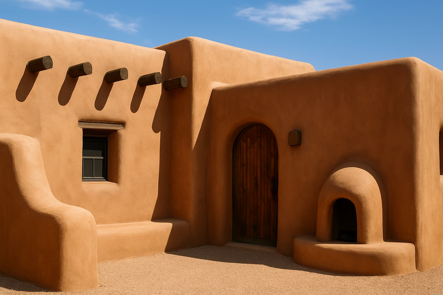 Curved adobe walls, flat roofs, and soft lines define Pueblo-style architecture